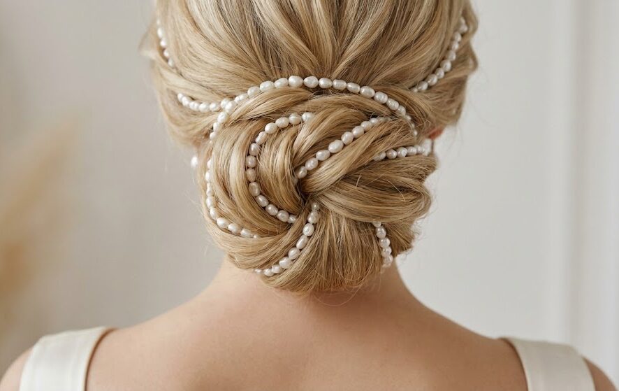 Vorbim despre șiraguri de perle țesute prin păr, panglici de catifea care susțin cocul sau lanțuri fine de aur inserate în împletitură.